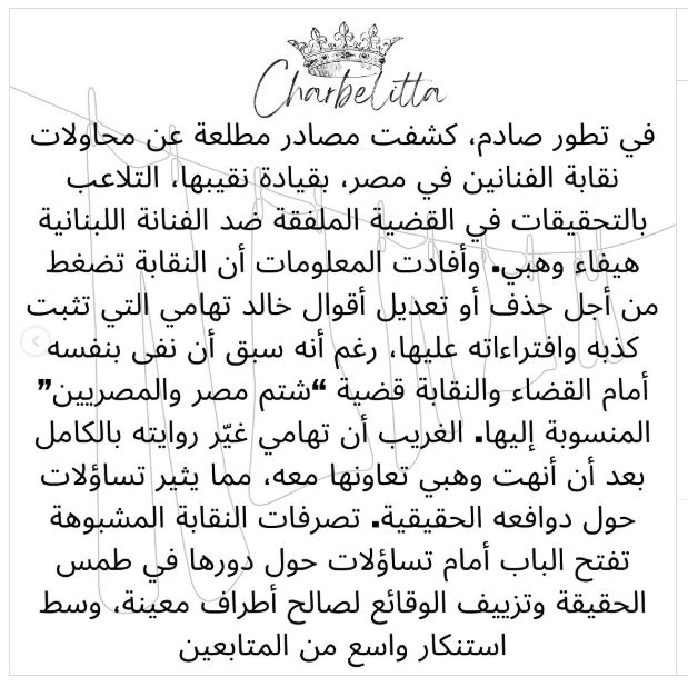 جديدة وبحسب ما كشفت صفحة شربيليتا المهتمة باخبار النجوم والمشاهير افادت ان النقابة في مصر تحاول التلاعب بالتحقيقات في القضية الملفقة ضد