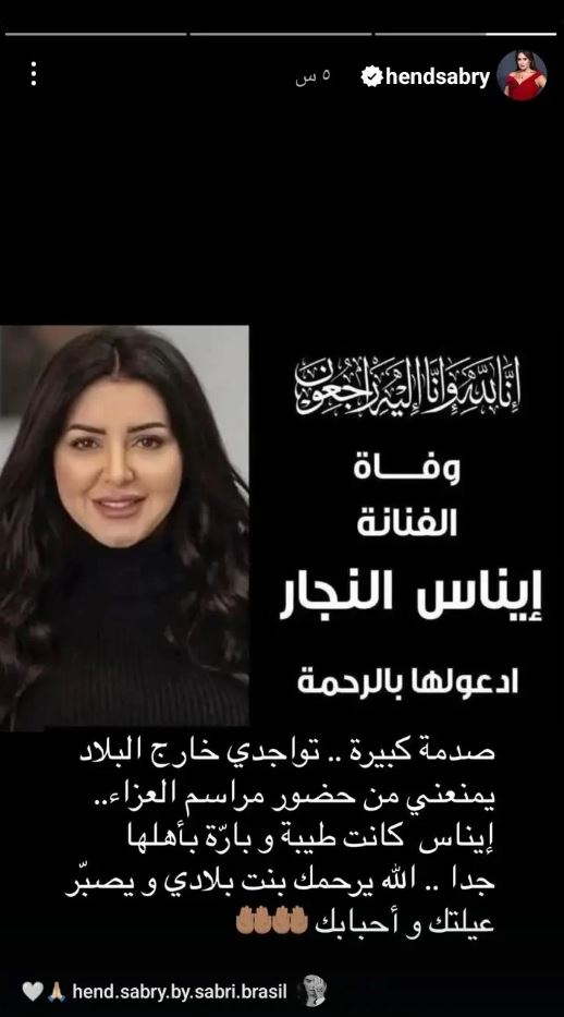 وكتبت هند في رسالتها: "نسأل الله أن يتغمّدها برحمته الواسعة ويغفر لها ويرزقها الجنة، إيناس كانت طيبة وبشوشة وبارّة بأهلها، أعتذر عن عدم حضور مراسم العزاء لتواجدي خارج البلاد، خالص عزائي لأسرة الفقيدة ومحبيها".