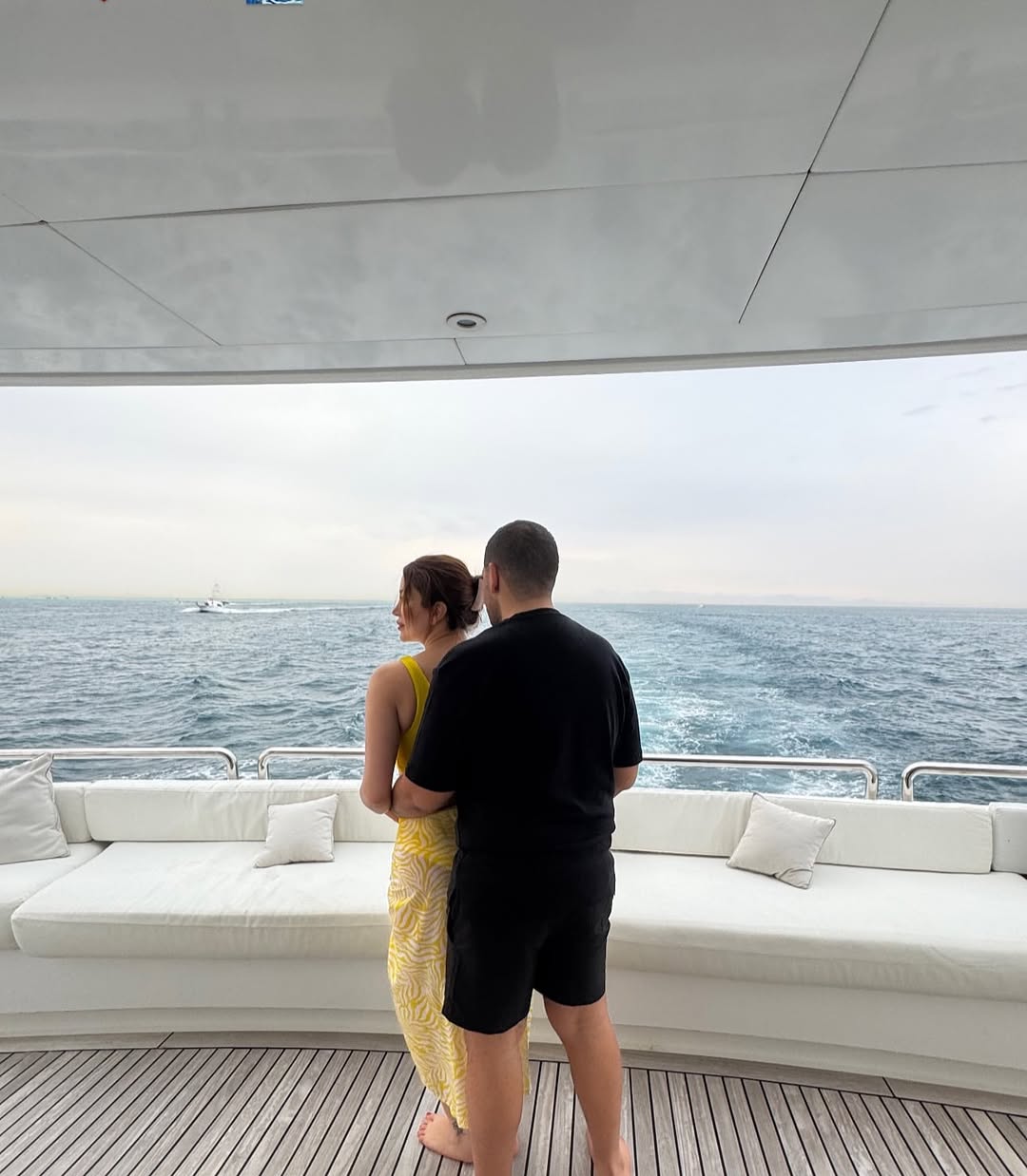 وظهرت نسرين طافش برفقة زوجها على متن يخت، وهما يرتديان ملابس السباحة، ويستمتعان بوقتهما، وبدى أحمد وهو يحتضن نسرين من الخلف، وينظران إلى البحر.