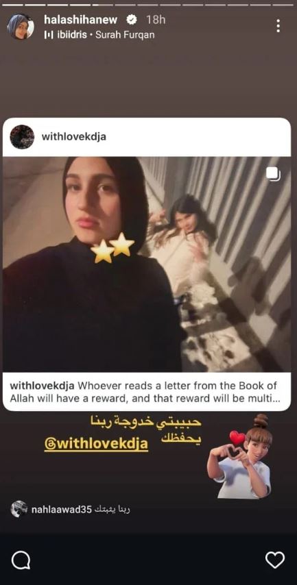 وعلّقت حلا على فيديوهات ابنتها قائلةً: "حبيبتي خدّوجة ربّنا يحفظك".