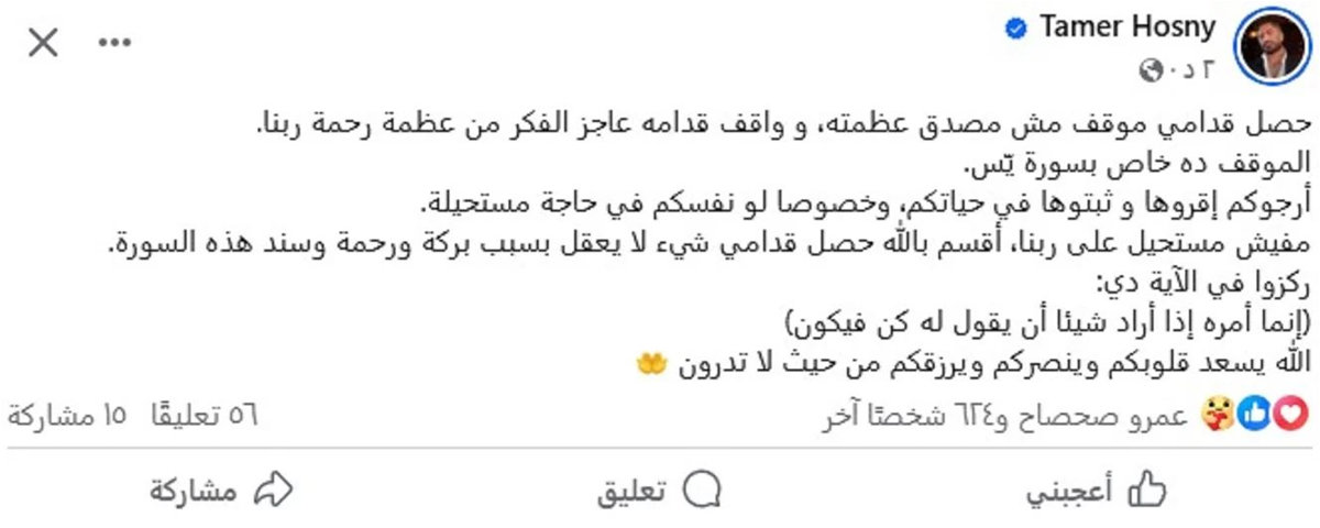 ووجه تامر نصيحة لجمهوره إذ قال: "حصل قدّامي موقف مش مصدّق عظمته، وواقف قدّامه عاجز الفكر من عظمة رحمة ربنا، الموقف ده خاص بسورة يّس".