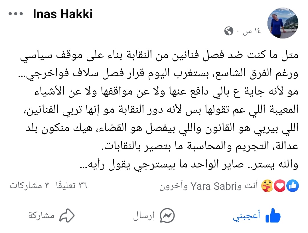 من جهتها، المخرجة السورية إيناس حقي، وهي واحدة من أبرز المعارضات لنظام الأسد المخلوع، أعربت عن استغرابها من القرار، مشيرة أنها كانت منذ البداية ضد فصل أي فنان من النقابة بناءً على موقف سياسي.