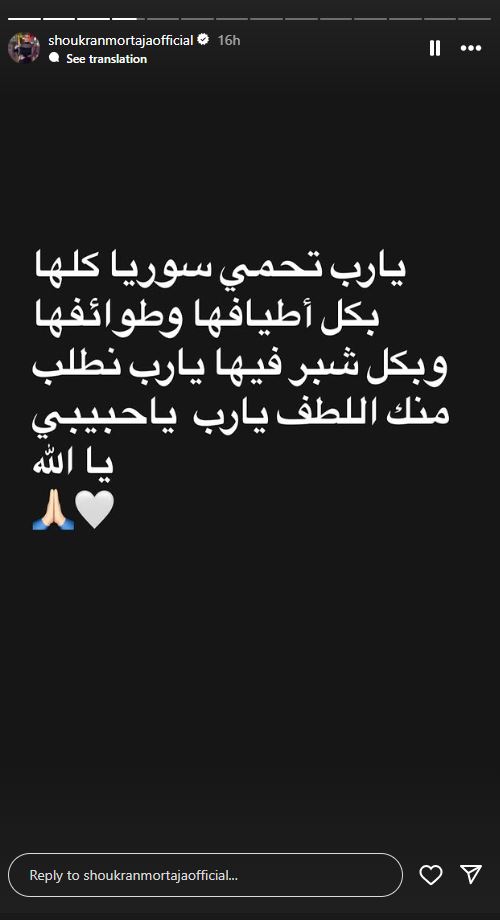 وفي التفاصيل، علقت الممثلة السورية شكران مرتجى على الاحداث الحاصلة في جرمانا، اذ نشرت مجموعة صور عبر خاصية القصص القصيرة على حسابها عبر انستغرام، قالت فيها: "يا رب تحمي سوريا كلها، بكل اطيافها وطوائفها، وبكل شبر فيها، يا رب نطلب منك اللطف يا رب يا حبيبي يا الله".