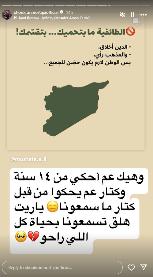 وفي ستوري أخرى قالت: "الطائفية مو رأي، الطائفية مرض"، كما نشرت صورة أخرى كتب عليها: "الطائفية ما بتحميك.. بتقسمك.. الدين اخلاق والمذهب رأي بس الوطن لازم يكون حضن للجميع"، وعلقت شكران على هذه الصورة بالقول: "وهيك عم احكي من 14 سنة وكتار عم يحكوا من قبل.. كتار ما سمعونا.. يا ريت هلق تسمعونا.. بحياة كل اللي راحوا".