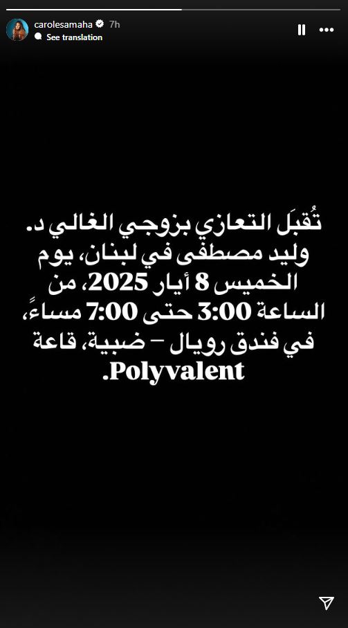 كارول سماحة “ستوري” عبر صفحتها الشخصية في “انستغرام”، وكتبت: “تُقبل التعازي بزوجي الغالي د. وليد مصطفى في