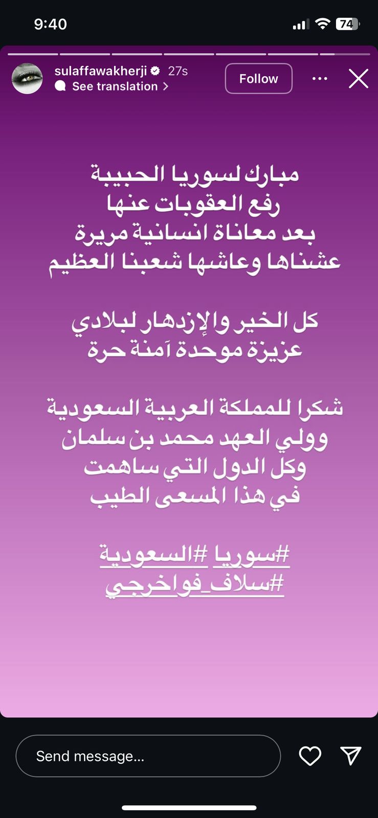 وفي التفاصيل، فقد كتبت سلاف عبر حسابتها على مواقع التواصل الإجتماعي: " مبروك لسوريا الحبيبة رفع العقوبات عنها بعد معاناة انسانية مريرة عشناها وعاشها شعبنا العظيم.. كل الخير والإزدهار لبلادي .. عزيزة موحدة آمنة حرة.. شكرا للمملكة العربية السعودية وولي العهد محمد بن سلمان وكل الدول التي ساهمت في هذا المسعى الطيب".
