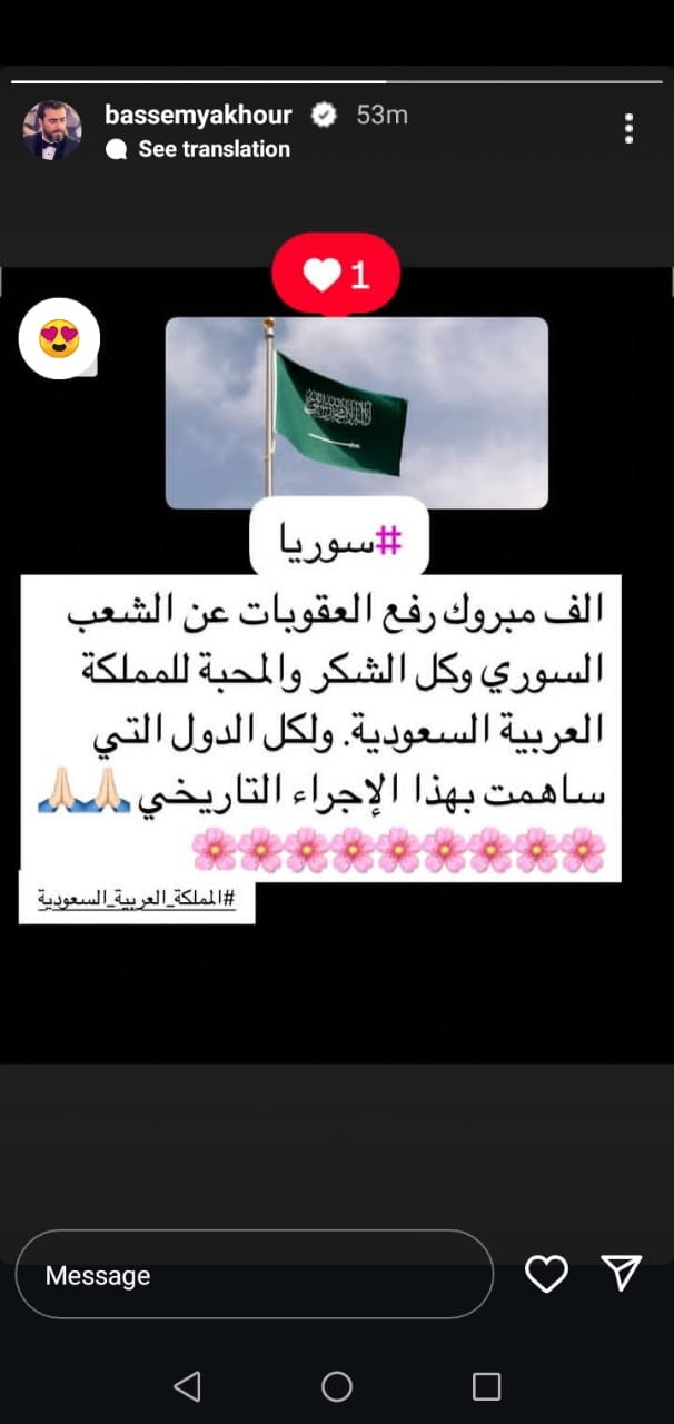 ومن جهته كتب الممثل باسم ياخور: " ألف مبروك رفع العقوبات عن الشعب السوري وكل الشكر والمحبة للمملكة العربية السعودية. ولكل الدول التي ستهمت بهذا الإجراء التاريخي".