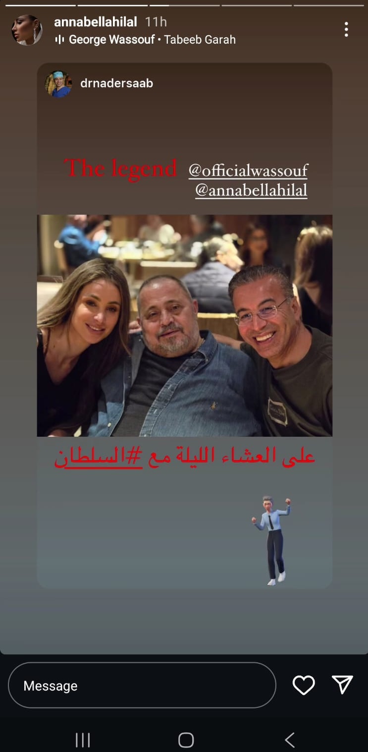 وحرص صعب وأنابيلا على الإشارة إلى أنّ الصور التقطت مع وسوف ليل أمس، للتأكيد أنّ كلّ الشائعات والأخبار المتداولة عن وضعه الصحيّ غير صحيحة.