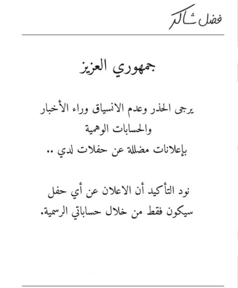 الأخبار والحسابات الوهمية التي تروّج لإعلانات مضلّلة عن حفلات لي"، مشدداً على أن أي إعلان رسمي سيصدر فقط عبر حساباته المعتمدة.