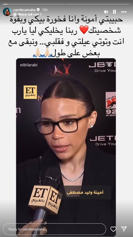 من جهتها، شاركت الفنانة اللبنانية كارول سماحة فيديو المقابلة عبر خاصية القصص القصيرة على حسابها عبر انستغرام، وارفقته بالتعليق التالي: "حبيبتي امونة وانا فخورة فيكي وبقوة شخصيتك.. ربنا يخليكي ليا يا رب انتي وتوتي عيلتي وفقلبي.. ونبقى مع بعض على طول".