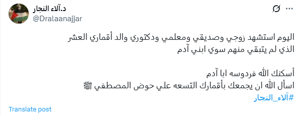 وفي أول تعليق للطبيبة آلاء النجار، عبرت عن حزنها الشديد لفقدانها زوجها من خلال تدوينة عبر صفحتها الشخصية في منصة "اكس"، وكتبت: "اليوم استشهد زوجي وصديقي ومعلمي ودكتوري والد أقماري العشر الذي لم يتبقي منهم سوي ابني آدم أسكنك الله فردوسه ابا آدم اسأل الله ان يجمعك بأقمارك التسعه علي حوض المصطفى".