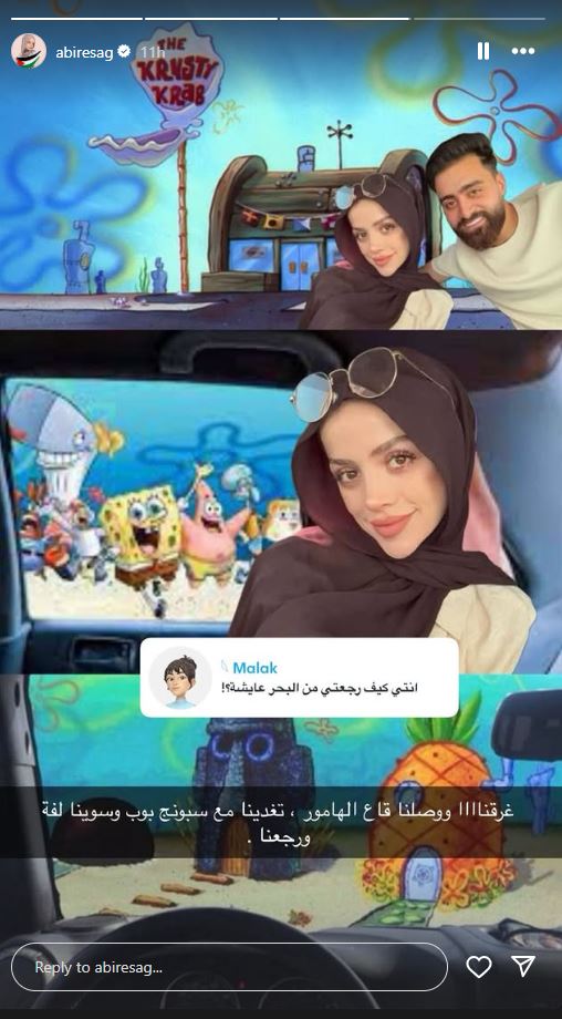 طريف من متابعيها، اذ سألها احدهم: "انتي كيف رجعتي من البحر عايشة؟"، لترد عليه مستعينة برسوم سبونج بوب، اذ قالت: "غرقنا ووصلنا قاع الهامور، تغدينا مع سبونج بوب وسوينا لفة ورجعنا".