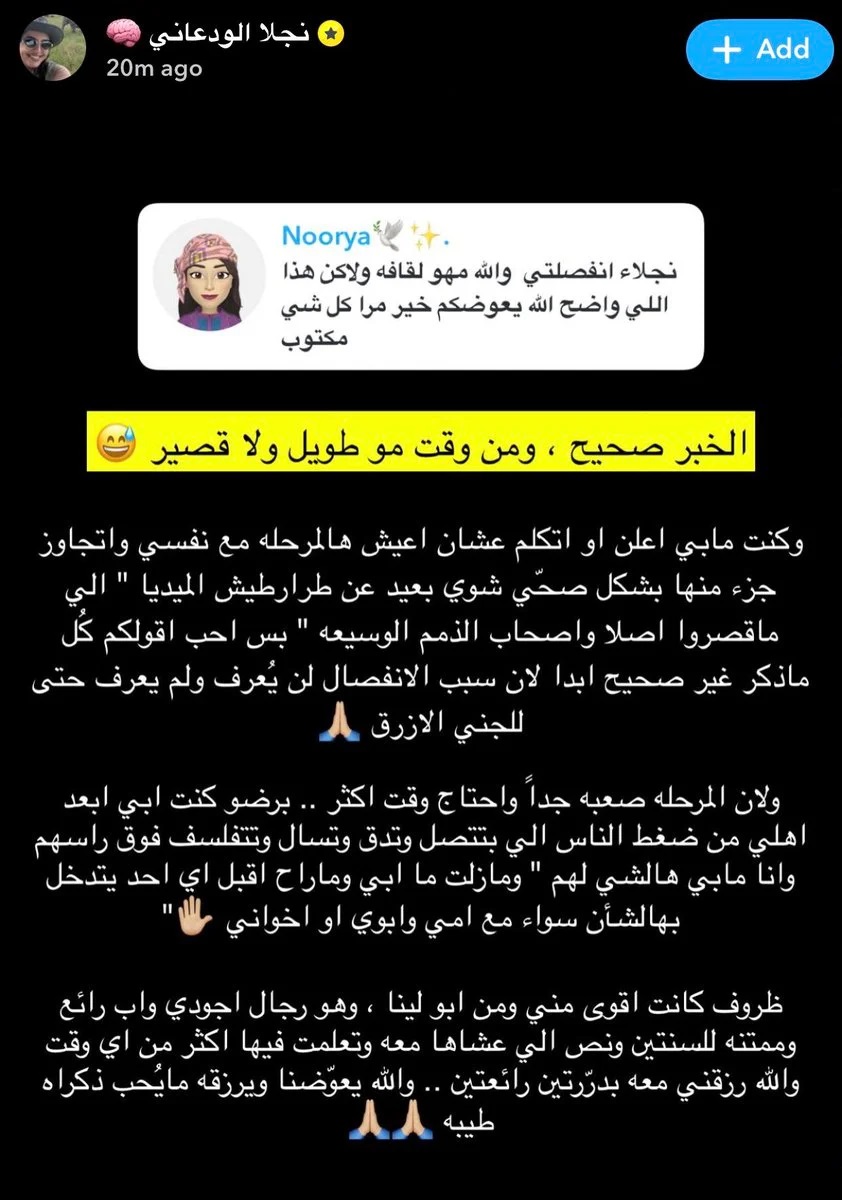 وتابعت: "ولان المرحله صعبه جداً واحتاج وقت اكثر .. برضه كنت اريد أن ابعد اهلي من ضغط الناس اللي بتتصل وتدق وتسأل وتتفلسف فوق راسهم وانا لا أريد هالشي لهم ومازلت لا ولن اقبل اي احد يتدخل بهالشأن سواء مع امي وابوي او اخواني".