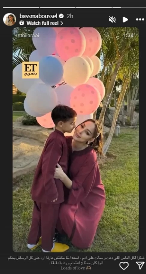 ونشرت بسمة عبر خاصية القصص المصوّرة الملحقة بحسابها الشخصي في موقع "إنستغرام"، صورة ظهرت فيها مع نجلها وجّهت من خلالها رسالة الى متابعيها قالت فيها: "شكراً لكل الناس اللي دعت وسألت على آدم، آسفة أنا مكنتش عارفة أردّ على كل الرسائل بحكم إنه كان محتاج اهتمام ورعاية دقيقة".