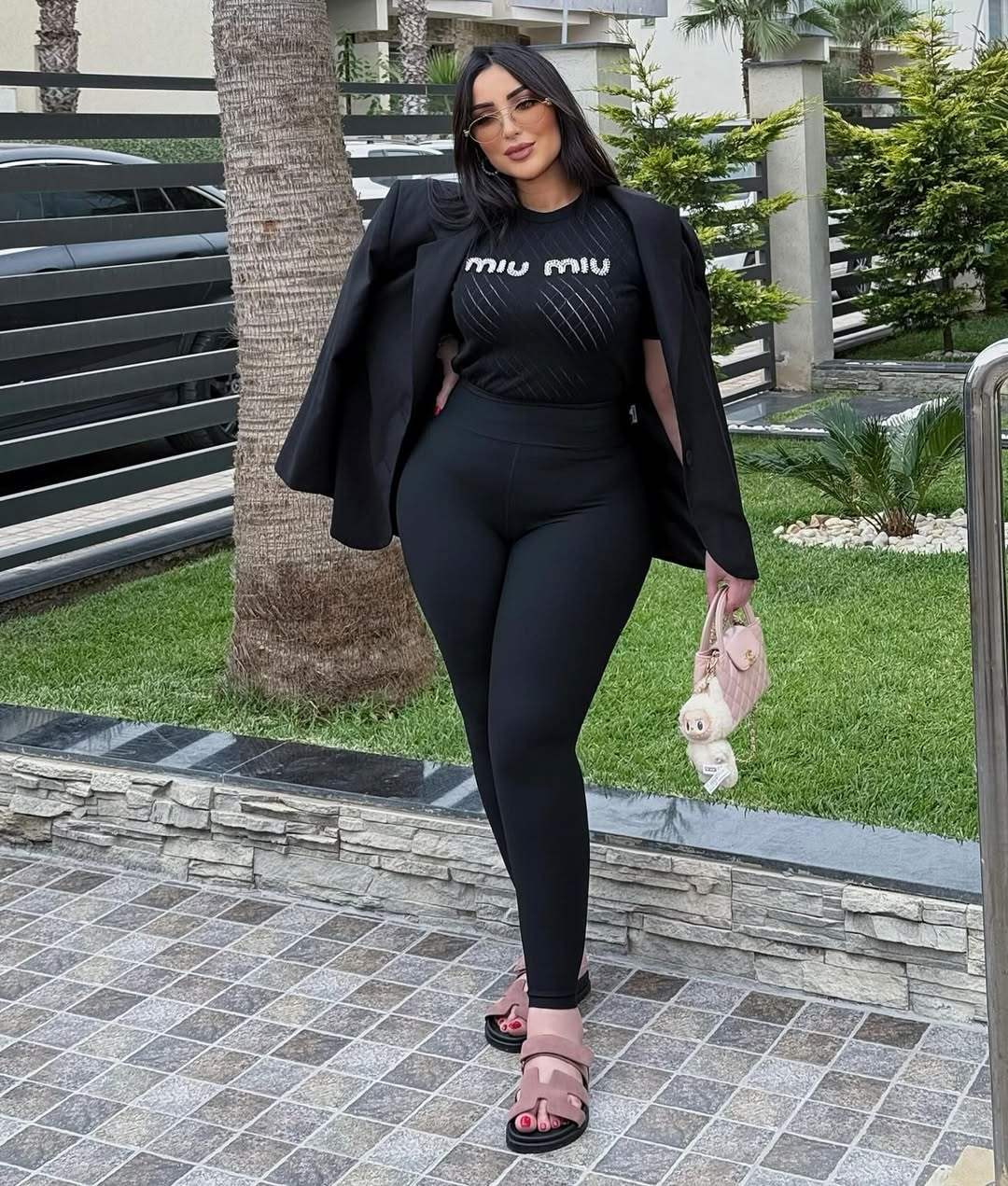 واختارت دنيا ملابس باللون الأسود عبارة عن "ليغنغ" ضيّق يبرز خصرها مع توب ناعم، وأضافت بلايزر على كتفيها لإخفاء وزنها الزائد الباقي بطريقة ذكية، وحملت حقيبة يد صغيرة الحجم زيّنتها بلعبة "لابوبو" الشهيرة.