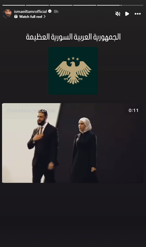 وايضاً الفنان السوري اسماعيل تمر، نشر صورة للهوية الجديدة عبر الستوري، بالإضافة لفيديو للرئيس الشرع وزوجته السيدة