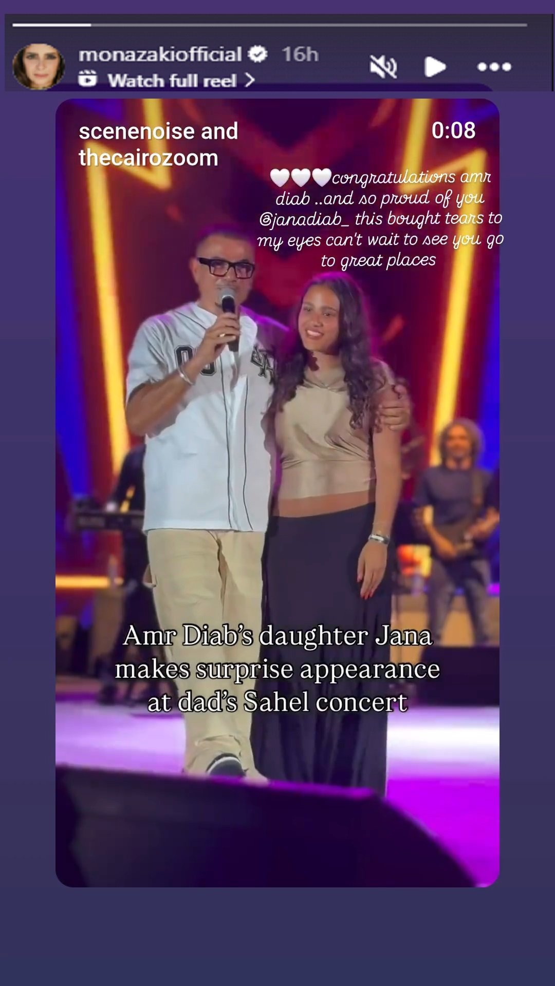 وكتبت منى معلقة على الصورة: "مبروك لعمرو دياب وفخورة جدًا بجنا.. المشهد ده خلّى دموعي تنزل بجد، منتظرة أشوفك بتوصلي لأعلى الأماكن".