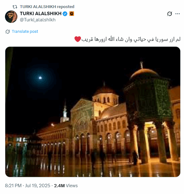وفي التفاصيل، شارك المستشار تركي آل الشيخ تدوينة عبر صفحته الشخصية على منصة "اكس"، كشفت من خلالها عن رغبته بزيارة سوريا.