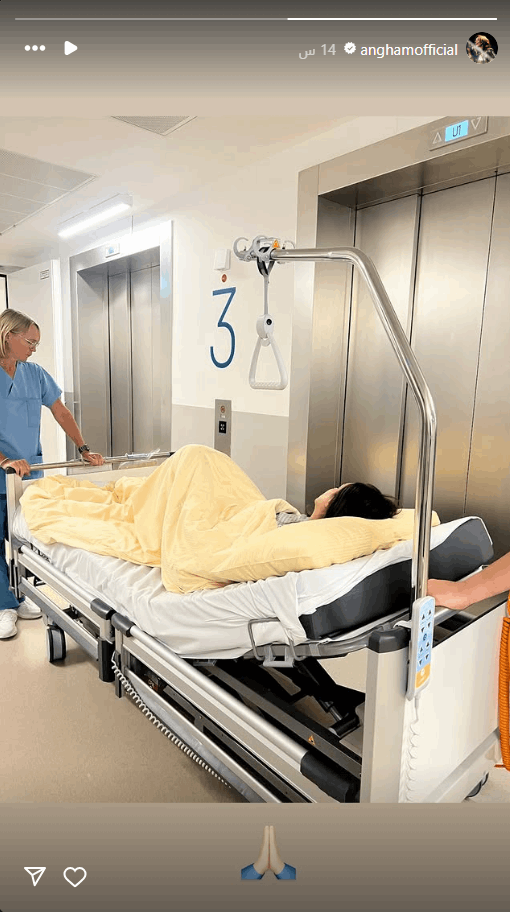 وظهرت انغام في الصورة من داخل المستشفى مستلقية على السرير بينما تستعد لإجراء معيّن.