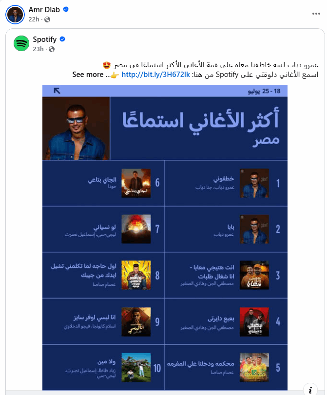 اللافت أيضاً في القائمة التي شاركها "الهضبة"، هو حضور عدد من مؤدي المهرجانات في المراكز من الثالث حتى العاشر، مقابل غياب تام لاسم تامر حسني، ما فتح باب التكهّنات حول الرسائل المبطّنة التي قد تحملها هذه الخطوة.