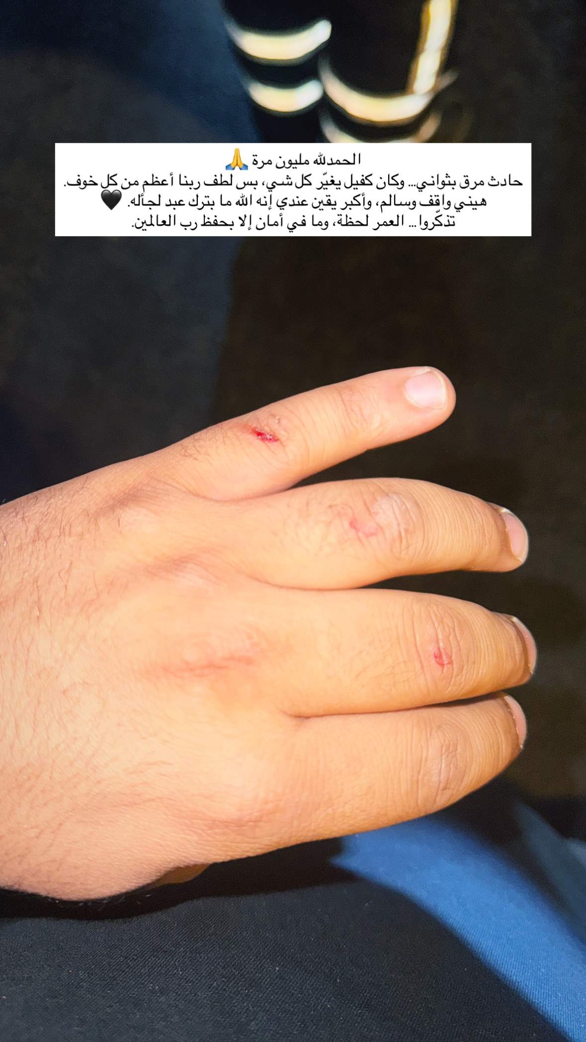 وفي الصورة الأخيرة، ظهرت يد الاخرس وقد تعرضت لبعض الجروح، وارفقها بتعليق شكر فيه الله عز وجل على لطفه به، وكتب: "الحمدلله مليون مرة، حادث مرق بثواني.. وكان كفيل يغيّر كلّ شي. بس لطف ربنا أعظم من كلّ خوف".