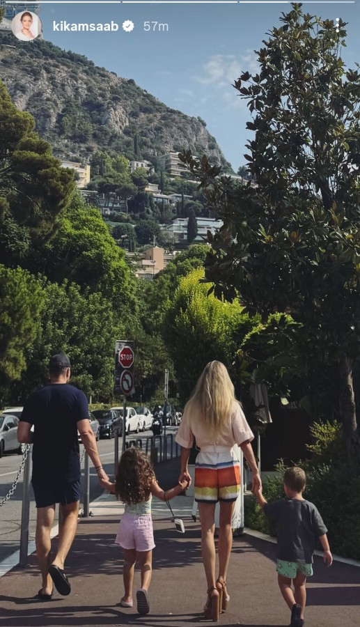 ولم تخلُ اللقطات من تفاصيل دافئة أخرى، إذ وثّقت صورة ثالثة تُظهر العائلة بكاملها تسير جنباً إلى جنب، يدًا بيد، في أحد الأزقة المحاطة بالخضرة، بملابس صيفية متناسقة من شورت وتوب، في مشهد يعبّر عن الحب والترابط العائلي.