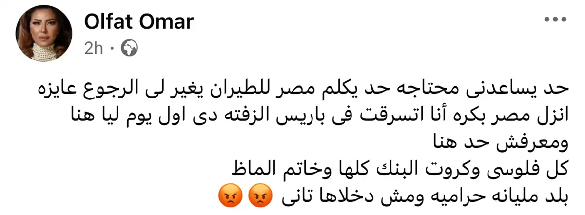 ونشرت ألفت عمر رسالة استغاثة عبر حساباتها على مواقع التواصل الاجتماعي تطلب فيها المساعدة للعودة إلى مصر. وكتبت ألفت في منشورها على "فيسبوك": "حد يساعدني محتاجة حد يكلم مصر للطيران يغير لي الرجوع عايزة أنزل مصر بكرة أنا اتسرقت في باريس الزفتة دي أول يوم لي هنا ومعرفش حد هنا، كل فلوسي وكروت البنك كلها وخاتم ألماس، بلد مليانة حرامية ومش هدخلها تاني".