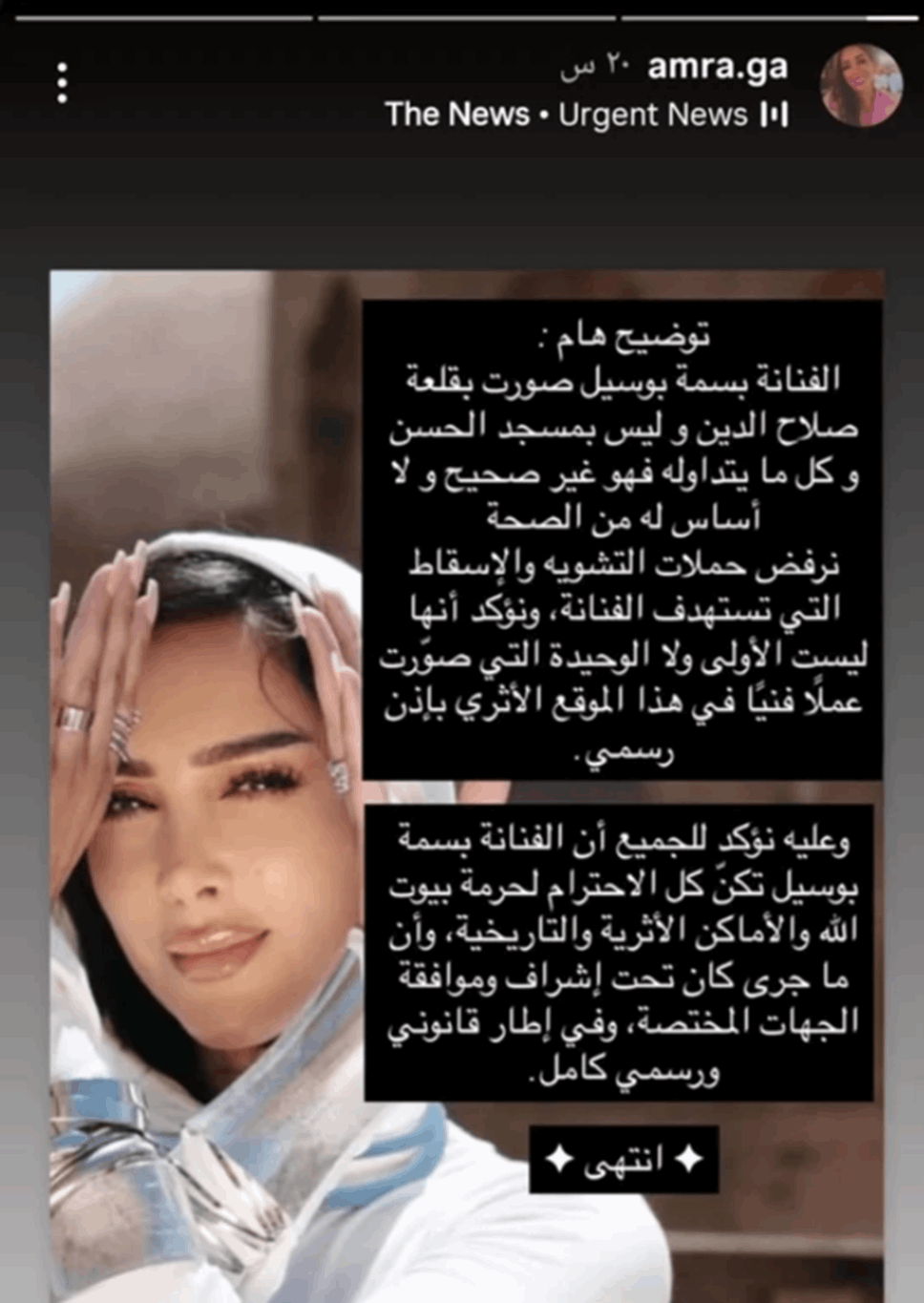 وشاركت والدة بسمة بوسيل خديجة الرحموني منشوراً في حسابها على "إنستغرام"، رأت فيه أن ابنتها تتعرض لحملة من التشويه والتسقيط، مؤكدةً أن بسمة لم تكن الفنانة الأولى ولا الوحيدة التي تصور في قلعة صلاح الدين، نافيةً أن يكون التصوير تم في جامع الحسن.