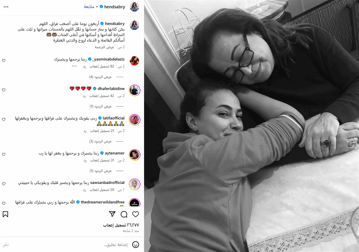 نشرت هند صبري صورة تجمعها بوالدتها، وأرفقتها بتعليق جاء فيه: أربعون يومًا على أصعب فراق.. اللهم يمّن كتابها، ويسّر حسابها، وثقّل بالحسنات ميزانها، وثبّت على الصراط أقدامها، وأسكنها في أعلى الجنات. أسألكم الفاتحة والدعاء لروح والدتي العطرة.