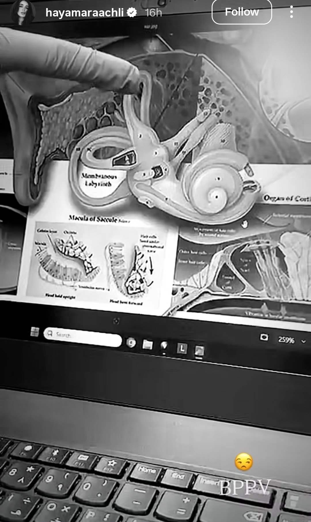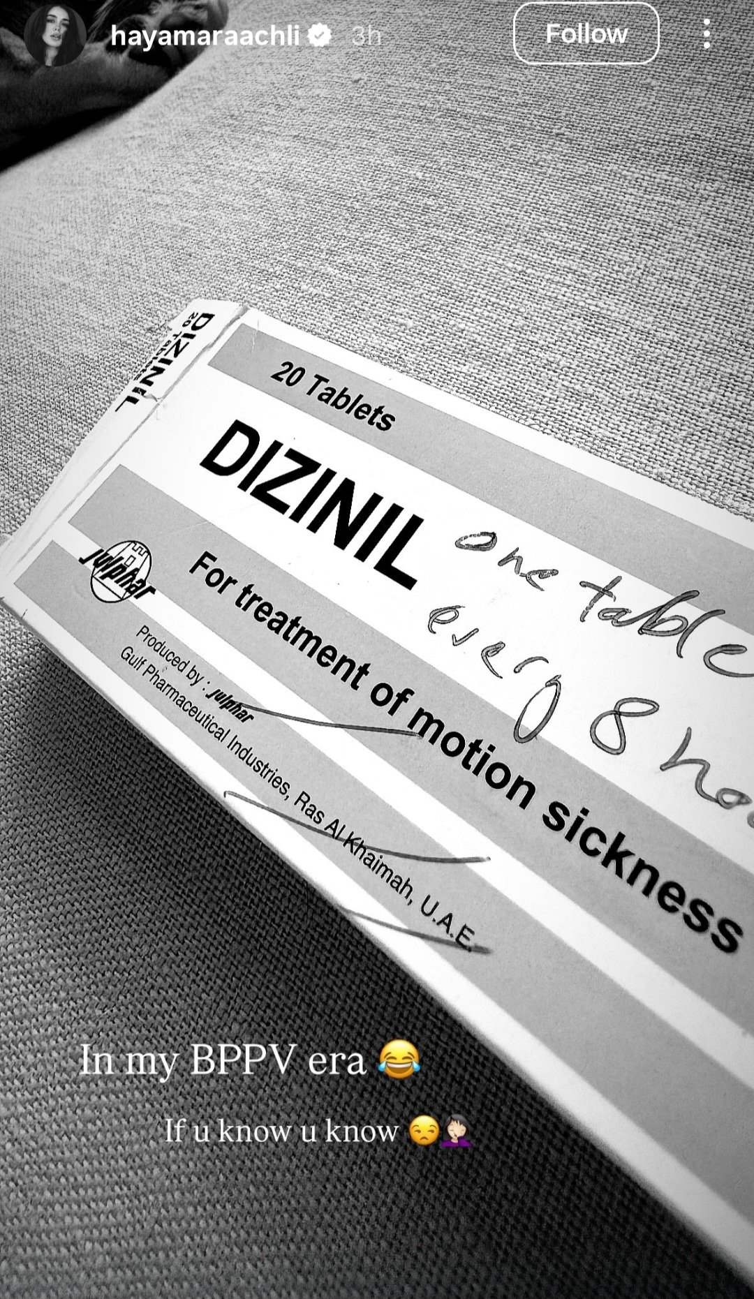 العربية "دوار الوضعة الانتيابي الحميد" أو "الدوار الموضعي الانتيابي الحميد"، وشاركت متابعيها عبر خاصية "الستوريز" تفاصيل العلاج الذي تتناوله لتخطي
