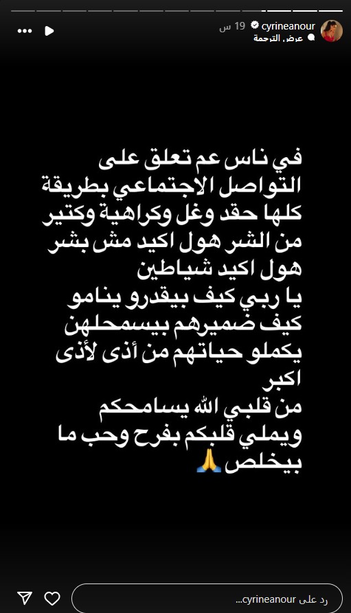 انستغرام كتبت فيها "في ناس عم تعلق على التواصل الاجتماعي بطريقة كلها حقد وغل وكراهية وكتير من الشر هول اكيد مش بشر هول اكيد شياطين يا ربي كيف بيقدرو ينامو كيف ضميرهم بيسمحلهن يكملو حياتهم من أذى لأذى اکبر من قلبي