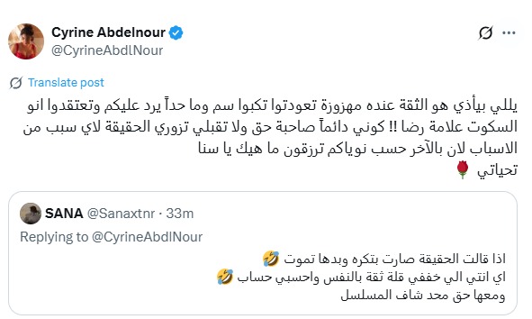 لتعود سيرين وتكتب رداً مطولاً، قالت فيه: "يللي بيأذي هو الثقة عنده مهزوزة. تعودتوا تكبوا سم وما حدا يرد عليكم وتعتقدوا إنو السكوت علامة الرضا. كزني دايماً صاحبة حق ولا تقبلي تزوري حقيقة لأي سبب من الأسباب، لأن بالاخر حسب نواياكم ترزقون… ما هيك يا سنا؟ تحياتي".