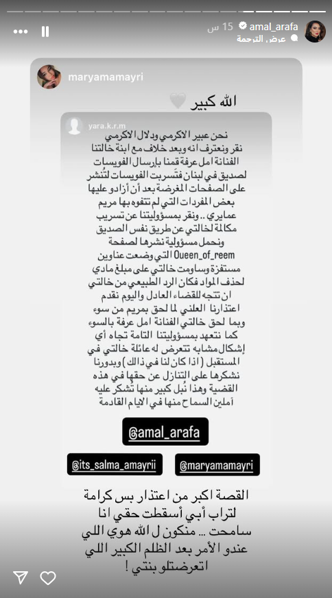 وأرفقت أمل عرفة نص الاعتذار بتعليق يكشف عن حجم الإساءة التي تعرضت لها مع ابنتها "مريم"، وكتبت: "القصة اكبر من اعتذار بس كرامة لتراب ابي اسقطت حقي انا سامحت.. منكون لـ الله هوي اللي عندو  الأمر بعد الظلم الكبير اللي اتعرضتلو بنتي".