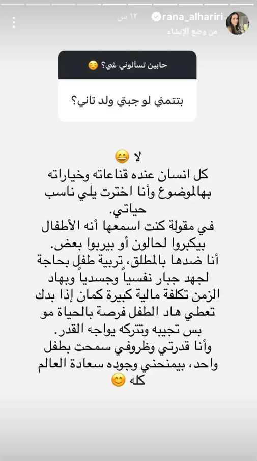وأكدت الحريري أنها راضية تماماً عن قرارها، مشيرة إلى أن قدراتها وظروفها الحالية سمحت بوجود طفل واحد يمنحها “سعادة العالم كله”، على حد تعبيرها.