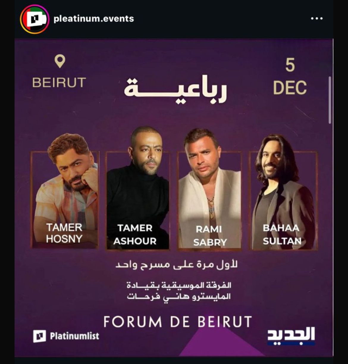 خلال الساعات الماضية، تداولت مواقع التواصل شائعات تزعم وجود سلسلة حفلات مرتقبة في لبنان لعدد من نجوم الغناء العرب، بينهم تامر عاشور، تامر حسني، بهاء سلطان، ورامي صبري، داخل الـForum de Beyrouth في كانون الأول.