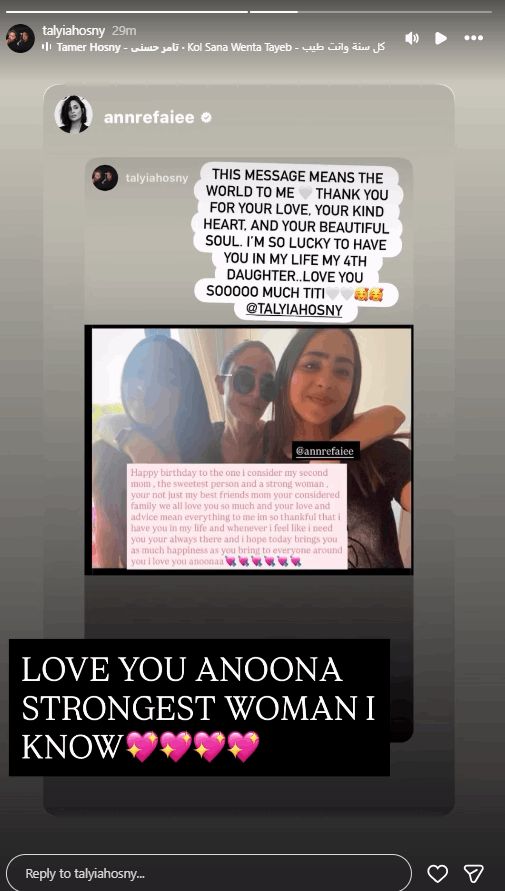 وكتبت تاليا عبر حسابها في انستغرام: "عيد ميلاد سعيد لمن أعتبرها أمي الثانية، يا ألطف إنسانة وامرأة قوية، أنتِ لستِ فقط أم صديقتي المقربة، بل فرد من عائلتي، كلنا نحبك كثيرًا، ونصائحكِ وحبكِ يعنيان لي الكثير، أنا ممتنة جدًا لوجودك في حياتي، وكلما احتجت إليكِ كنتِ دائمًا موجودة، أتمنى أن يجلب لك هذا اليوم سعادة مماثلة لما تمنحين من حولك، أحبك يا أنونا".