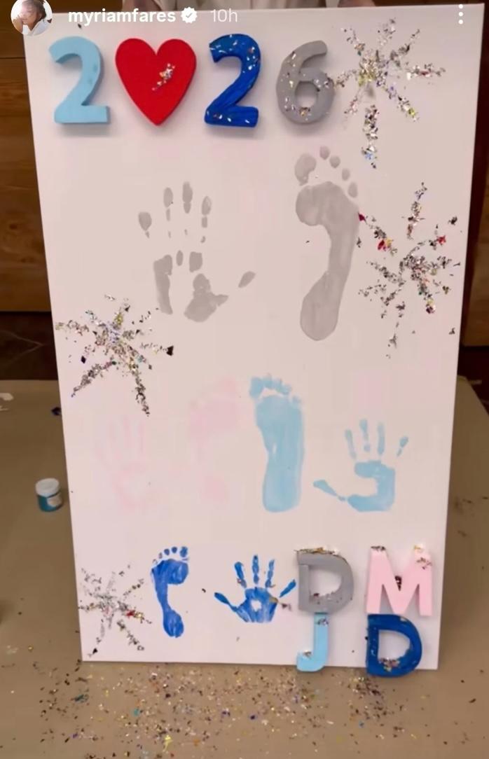 وخلال هذه اللقطات التي شاركتها مع جمهورها، وثقت ميريام لحظة عائلية دافئة بمشاركة زوجها السيد داني متري، حيث قاموا بطباعة أشكال أقدامهم وأيديهم مع الحروف الأولى من أسمائهم وتزيينها بأسلوب فني، مع استمرارها في اتباع نهج الخصوصية من خلال اختيار زوايا تصوير علوية تخفي ملامح زوجها.