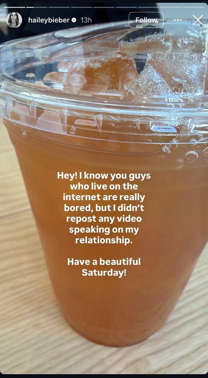 وعبر خاصية "الستوري" على منصة إنستغرام، ردت هايلي بشكل مباشر على الادعاءات التي انتشرت مؤخراً وتزعم بأنها أعادت مشاركة مقطع فيديو عبر "تيك توك" تحدث عن وجود خلل في علاقتها الزوجية. وكتبت هايلي بلهجة حازمة وساخرة: "أعلم أنكم يا من تعيشون على الإنترنت تشعرون بالملل الشديد، لكنني لم أُعد نشر أي فيديو يتحدث عن علاقتي.. أتمنى لكم يوم سبت جميلاً".