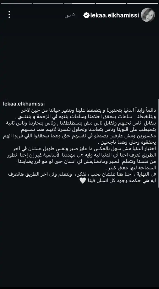 وعبر خاصية “ستوري” على إنستغرام، شاركت لقاء الخميسي متابعيها كلمات صادقة عن تقلبات الحياة والضغوط اليومية، من دون الإشارة المباشرة إلى أزمة الطلاق، حيث كتبت أن الحياة تختبر الإنسان باستمرار، وتضغط عليه، وتغيّر مساراته من وقت إلى آخر.