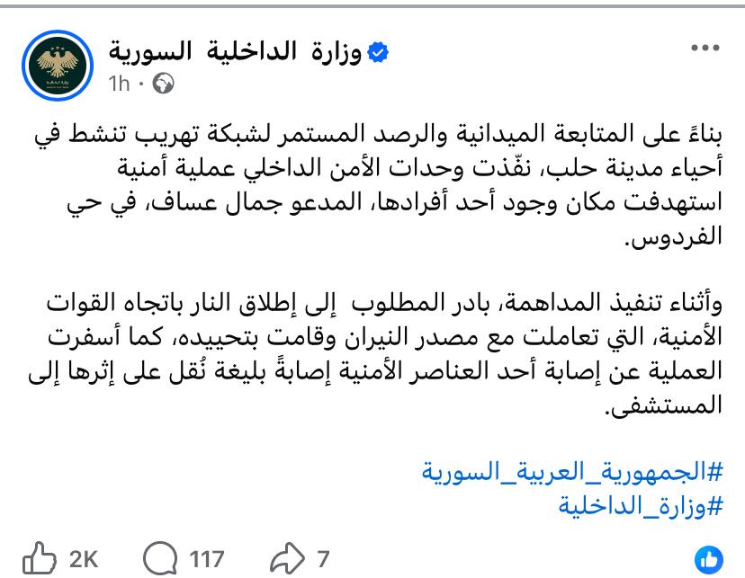 وأوضحت الوزارة في بيانها أن العملية التي جرت في حي الفردوس بمدينة حلب، تطورت إلى مواجهة مباشرة بعد أن