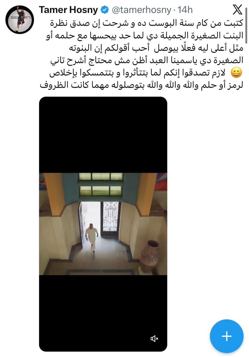 ونشر تامر عبر حسابه على منصة “X” مقطع فيديو تضمّن منشورًا سابقًا كان قد كتبه بعد تصوير إعلان داخل معهد الموسيقى، حيث التقى حينها بعدد من الطلاب الذين أمضوا وقتًا معه وطرحوا عليه أسئلة حول مشواره الفني.