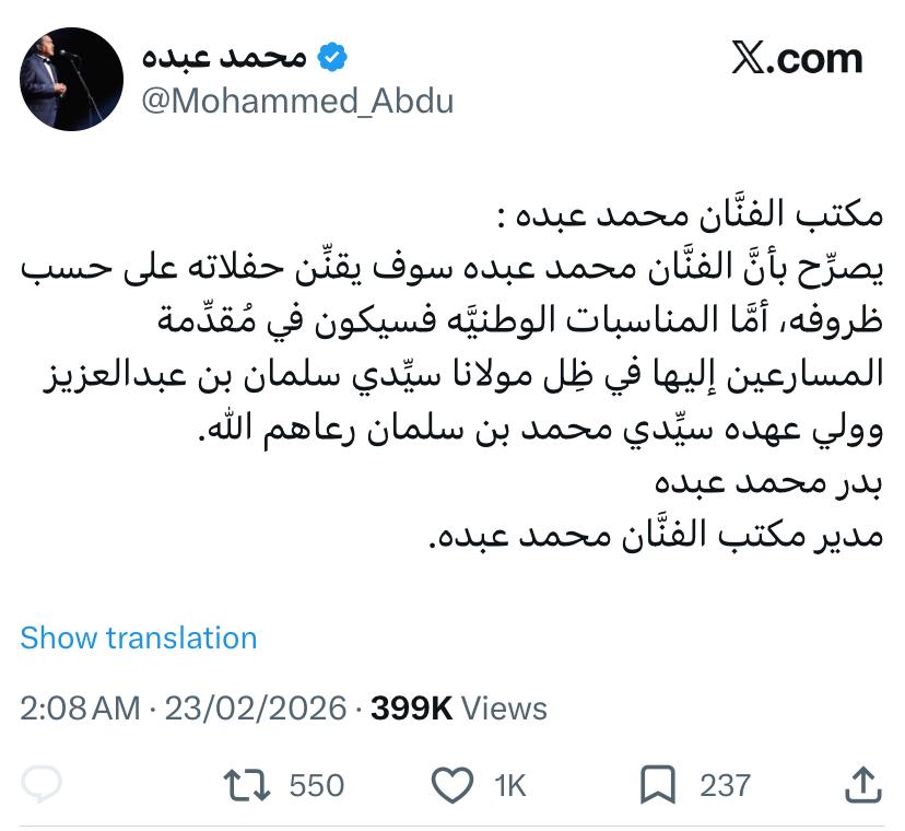 وحسماً لهذا الجدل الواسع، أصدر مكتب الفنان محمد عبده تصريحاً رسمياً على لسان مدير مكتبه، بدر محمد عبده، أوضح فيه الموقف الحقيقي للفنان تجاه نشاطه الفني المستقبلي، حيث ذكر التصريح أن فنان العرب سوف يقوم بـ "تقنين حفلاته" بناءً على ظروفه الخاصة، مؤكداً في الوقت ذاته أن محمد عبده سيظل في مقدمة المسارعين للمشاركة في كافة المناسبات الوطنية، تحت ظل قيادة خادم الحرمين الشريفين الملك سلمان بن عبدالعزيز وسمو ولي عهده الأمين الأمير محمد بن سلمان رعاهم الله.