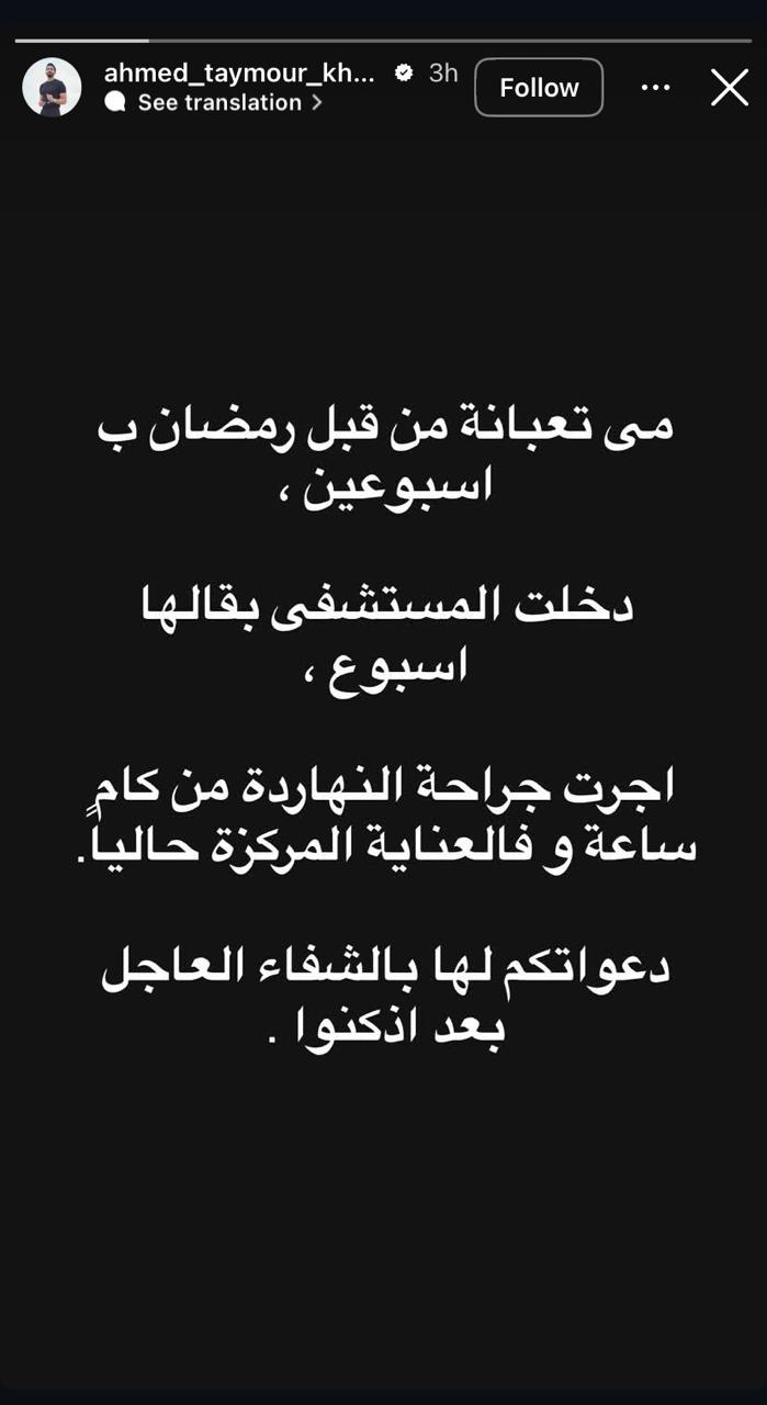 حيث أكد عبر حسابه الرسمي في إنستغرام أن مي كانت تعاني من التعب منذ ما قبل شهر رمضان بأسبوعين,  ودخلت المستشفى منذ أسبوع كامل لتستقر حالياً في غرفة العناية المركزة تحت الملاحظة الطبية الدقيقة.