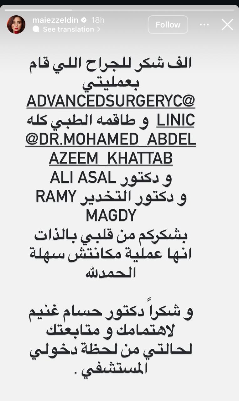 واليوم، تكتمل الصورة بكلمات مي عز الدين التي شاركتها عبر خاصية "الستوري"، حيث لم تكتفِ بطمأنة الجمهور بل كشفت عن صعوبة التجربة التي عاشتها قائلة: "العملية لم تكن سهلة". وفي لفتة إنسانية مؤثرة، وجهت مي رسائل شكر خاصة لطاقمها الطبي، وعلى رأسهم الجراح دكتور حسام غنيم وطبيب التخدير، مشيدة باهتمامهم الفائق بحالتها منذ لحظة دخولها المستشفى وحتى تجاوزها الخطر، لتؤكد لجمهورها أنها بدأت أخيراً تتماثل للشفاء بعد تلك الرحلة الصحية القاسية التي واجهتها بكل قوة.