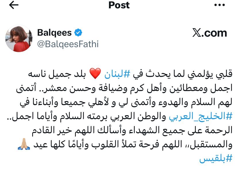 وقالت بلقيس في منشورها إن قلبها يتألم لما يحدث في لبنان، واصفةً البلاد بأنها من أجمل الدول وشعبها من أكثر الشعوب كرمًا وعطاءً. وأكدت أن اللبنانيين معروفون بحسن الضيافة وطيب المعشر، معربةً عن أملها في أن يعم السلام والهدوء هذا البلد الذي يواجه تحديات قاسية.