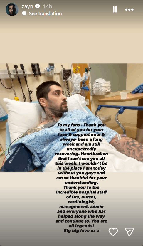كما حرص زين مالك على توجيه الشكر للفريق الطبي الذي أشرف على حالته، من أطباء وممرضين، واصفاً إياهم بـ"الأبطال"، في لفتة إنسانية لاقت إشادة واسعة.