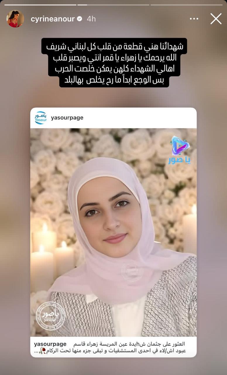هذه المأساة استدعت تفاعلاً واسعاً، حيث عبّرت الفنانة سيرين عبد النور عن حزنها بكلمات مؤثرة، رثت فيها زهراء ووصفتها بـ“القمر الذي انطفأ”، مؤكدة أن وجع الحرب لا ينتهي حتى وإن صمتت المدافع، وأن هؤلاء الشهداء هم جرح في قلب كل لبناني.