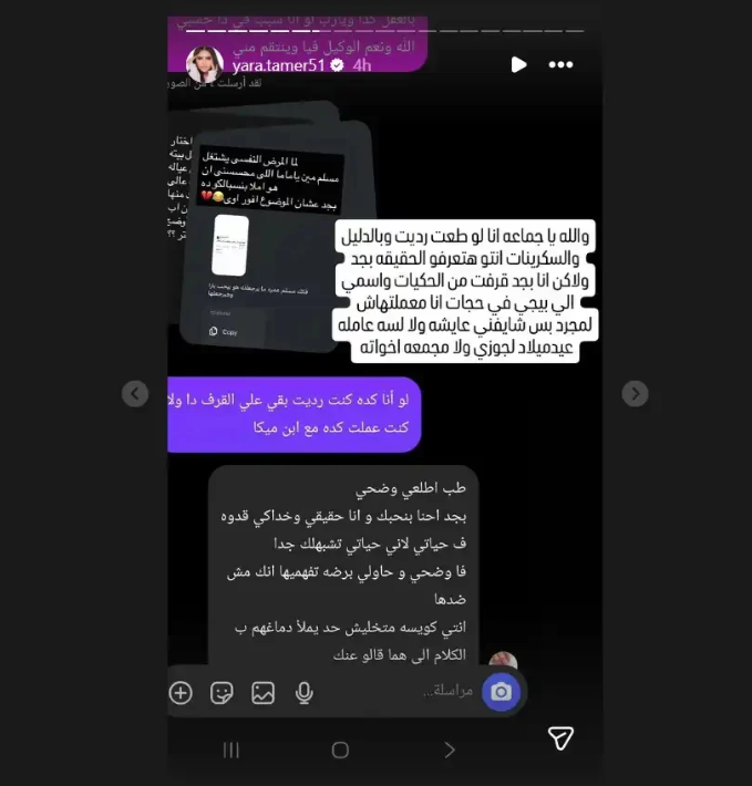في المقابل، دخلت زوجة مسلم الحالية يارا تامر على خط الأزمة، رافضةً الزج باسمها في الخلاف، ومؤكدةً عبر "إنستغرام" أنها تمتلك الأدلة التي تثبت عدم تورطها في تعطيل النفقة، لكنها فضّلت عدم نشرها، معتبرةً أن ما يحدث "حكايات" لا تريد الانخراط فيها.