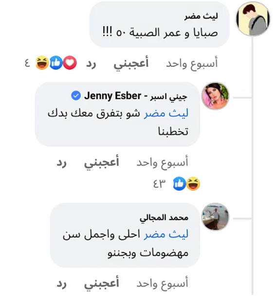 وكتب المتابع في تعليق لـ جيني عبر مواقع التواصل الاجتماعي: "صبايا وعمر الصبية 50؟".