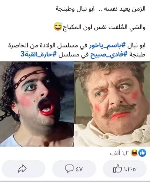 واستذكر المتابعون شخصية "أبو نبال" في مسلسل "الولادة من الخاصرة" التي أداها الفنان باسم ياخور، حيث علقت متابعة "خطر ببالي مسلسل الولادة من الخاصرة لما شفت هذا المقطع من المسلسل".